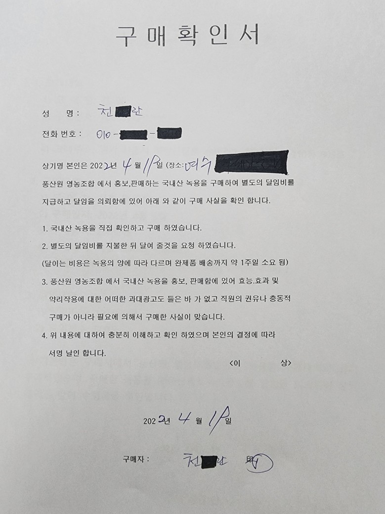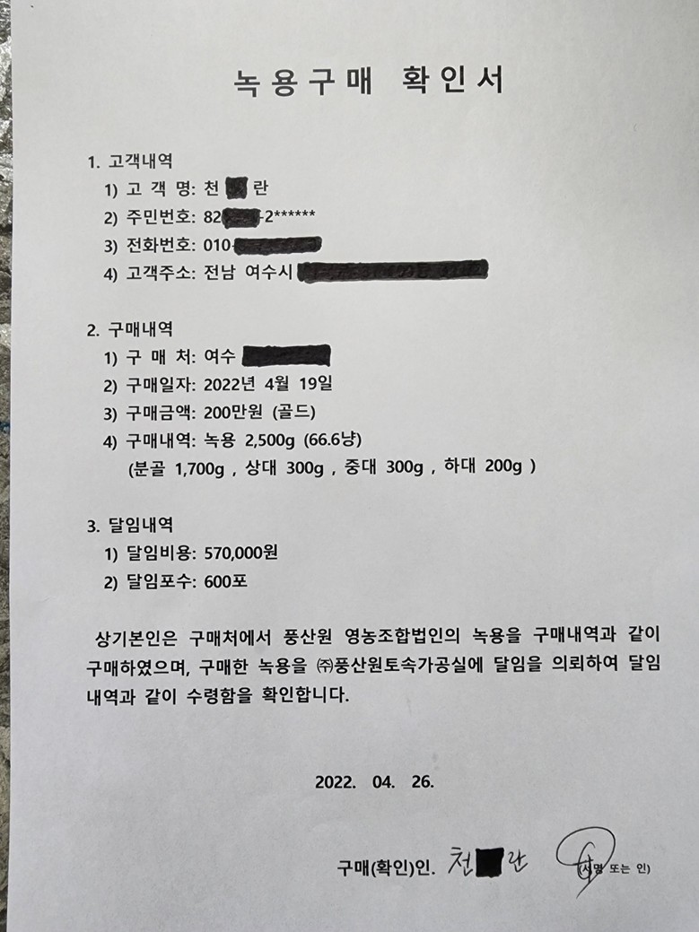 ① 녹용 구매확인서