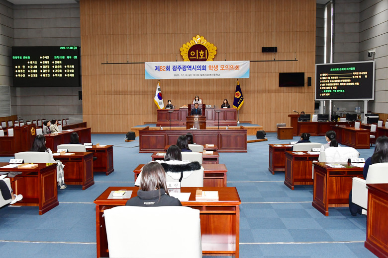 [광주 세계타임즈=손권일 기자] 광주광역시의회(의장 정무창)는 12월 8일(금) 오전 10시 시의회 본회의장에서 살레시오여자중학교 학생들을 대상으로 ‘광주광역시의회 제82회 학생 모의의회’를 개최했다.