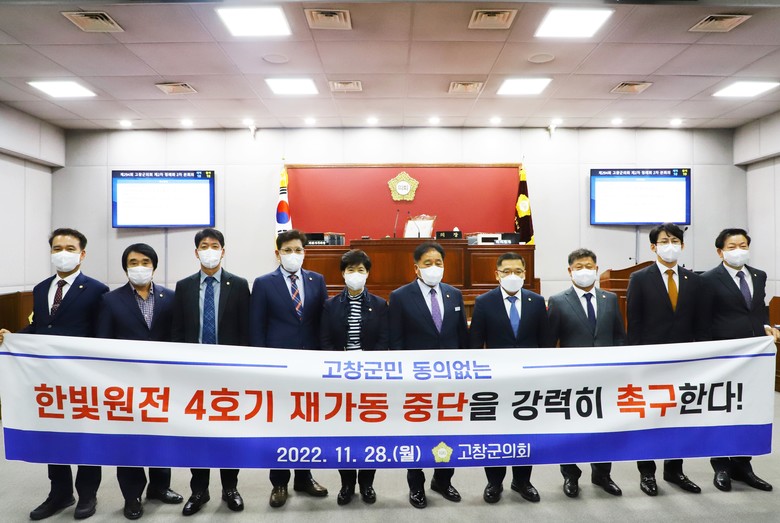 한편, 고창군의회는 지난달 28일 제294회 제2차 정례회에서 한빛4호기 재가동 중단 촉구 결의안을 채택한 바 있고, 지난달 30일 고창군 한빛원전범군민대책위원회·고창 원자력안전협의회 위원들과 함께 서울 원자력안전위원회에서 결의문을 발표하고 성명서를 원안위 측에 전달하였으며, 지난 7일에는 직접 한빛원자력본부를 항의방문하여 안전성이 담보되지 않는 재가동 승인에 대해서 강력하게 규탄하는 기자회견까지 실시한 바 있다.