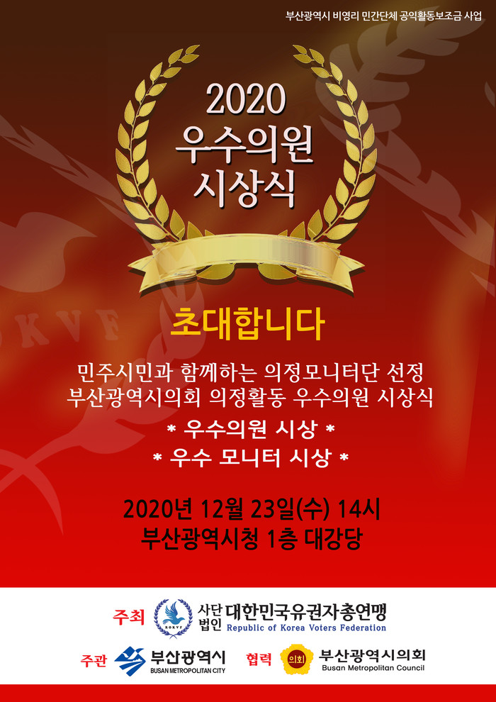 대한민국유권자총연맹(대표 김희매, 공동대표 강병령)은 21일 보도자료를 통해 2020년 부산시의회 의정활동 우수의원 명단을 발표하고 23일 14시 부산광역시청 12층 국제회의장에서 시상식을 가진다고 밝혔다.