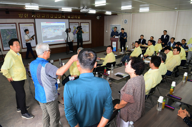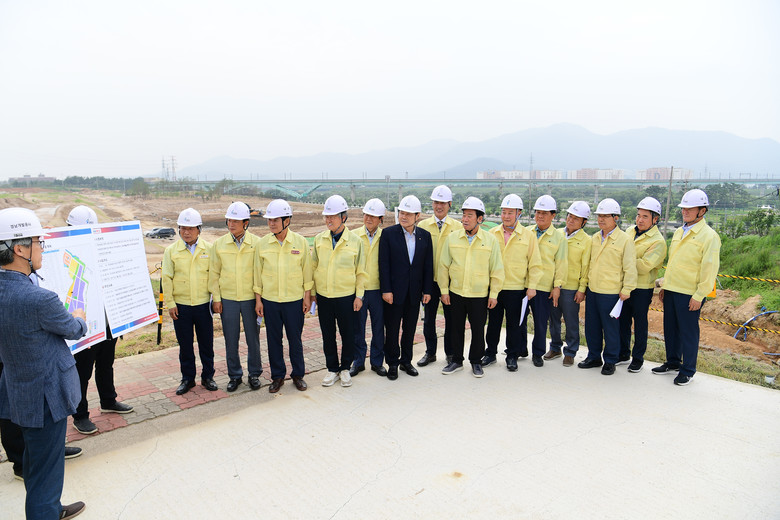 의장단은 먼저 양산 가산일반산업단지 현장을 방문하여 경남개발공사 김무열 단장으로부터 공사추진현황을 청취하고 애로사항과 향후계획 등을 꼼꼼히 점검했다. 김진부 의장은“가산산업단지의 조속한 준공과 분양이 이루어져 지역경제가 더욱 활성화되는 계기가 되길 바라며 기록적인 집중호우로 발생할 수 있는 각종 안전사고에 유의하여 현장관리에 만전을 기해줄 것”을 당부했다.
