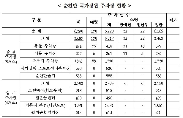 순천만 국가정원의 주차장 현황입니다. 상설주차장만 3,687면으로 대형버스 주차공간도 170면을 확보하고 있습니다. 태화강 지방정원과 확연한 차이를 보이고 있습니다. 이런 심각한 주차난 속에 과연 타지 관광객들이 지속적으로 태화강 정원을 방문할 지 의구심이 듭니다. 호기심에 한번 찾아왔다가 주차 불편으로 다시는 찾아오지 않는다면 국가정원 지정은 의미가 없을 것입니다.