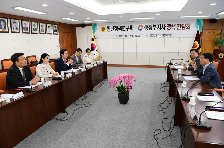 [경남 세계타임즈=최성룡 기자] 경상남도의회 의원 연구단체인 ‘청년정책연구회’(회장 정재욱 의원, 이하 “연구회”)는 10월 17일 도의회 의정회의실에서 경남도 최만림 행정부지사, 강석 도민소통특별보좌관과 함께 청년정책 발굴을 위한 간담회를 가졌다.