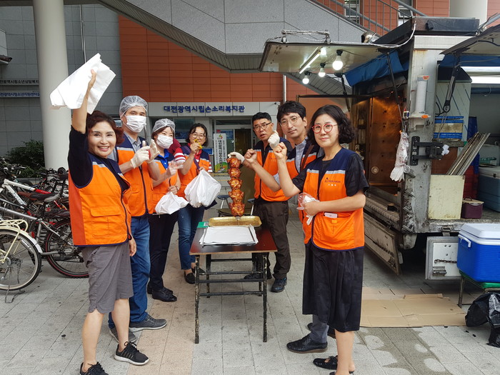[대전=세계타임즈 이장성 기자] 대전시 소외계층을 위해서 다양한 봉사활동을 실천하고 있는 대전시 SNS 8천명 봉사단체 사단법인 사랑의 사다리 밴드(리더 이정제)는 일 오후14시, 대전광역시립손소리복지관(관장 유형걸)에서 청각장애인 60명에게 바비큐 통닭 봉사로 우리 사회의 따뜻한 사랑을 실천 하였다.