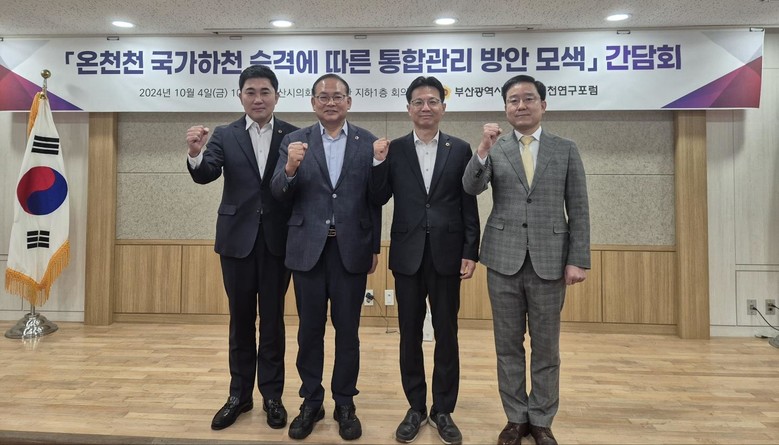 [부산 세계타임즈=이용우 기자] 부산광역시의회 의원연구단체 ‘온천천연구포럼 (대표 안재권 의원(연제구1, 국민의힘)'이 주최하는 「온천천 국가하천 승격에 따른 통합관리 방안 모색」간담회가 4일(금). 10시 30분 부산시의회 의원회관 회의실에서 개최됐다.