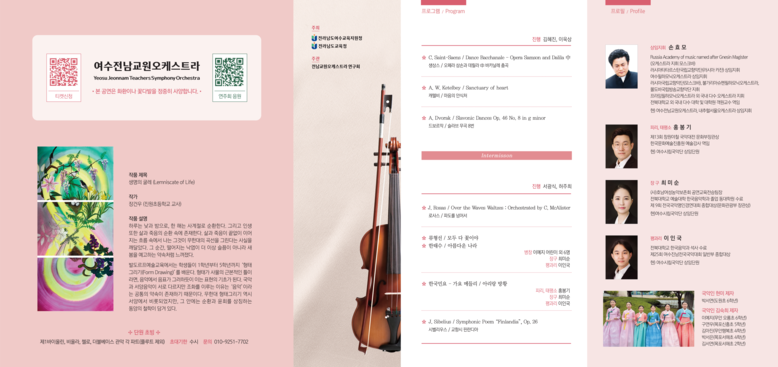 전남 지역 초·중·고 교직원과 학생 등 총 70명이 무대에 올라 생상스의 ‘바카날레’, 드보르작의 ‘슬라브 무곡 8번’, 시벨리우스의 ‘핀란디아’ 등 클래식 명곡을 비롯해 국악기 협연이 더해진 ‘모두 다 꽃이야’, ‘아름다운 나라’ 등을 선사한다. 관객들은 정통 오케스트라와 국악이 공존하는 색다른 음악을 즐길 수 있다.
