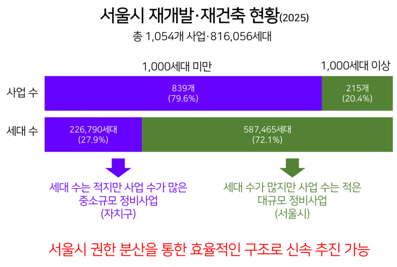 정 구청장은 “현재 서울시 내에서 지정이 완료되었거나 추진 중인 재개발·재건축 정비구역은 총 1,054곳이며, 이 중 1,000세대 미만의 중소규모 사업이 839곳으로 전체의 79.6%를 차지한다”고 밝혔다. “그러나 이들이 공급할 수 있는 세대 수는 22만 8,591세대로 전체의 27.9%에 불과하다”며 “반면 1,000세대 이상 대규모 정비사업은 215곳(20%)에 불과하지만, 공급 세대 수는 58만 7,465세대로 전체의 70% 이상을 차지한다”고 설명했다.
