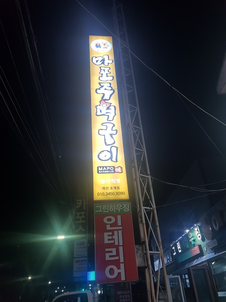 이집에 들어서면 옛날 선술집 같은 운치가 나는 실내도 특별할 것 없는 오래된 고깃집 모습에 아담하고 그리 넓지 않은 실내공간이 운치가 있다.'마포주먹구이' 내서점을 오픈하지 4개월 조금 지났지만 이집의 주인장은 창원 마산에서 이미 수 년쨰 "고기'집을 경영해 온 명인이다.