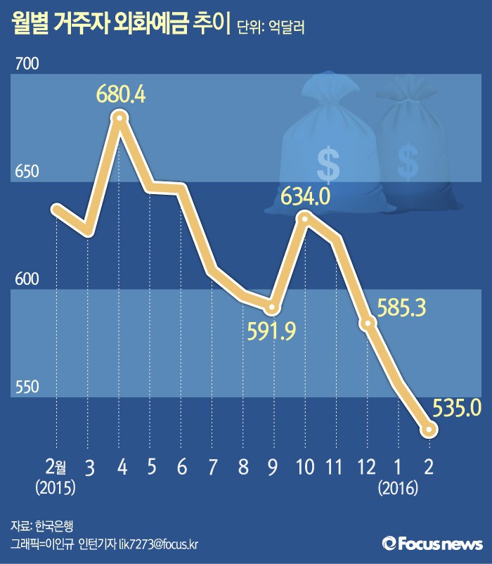 (서울=포커스뉴스) 한국은행이 10일 발표한 '2016년 2월 말 거주자 외화예금 현황'에 따르면 2월 말 외화 예금은 535억달러로 지난 1월 말보다 21억3000만달러 감소했다.