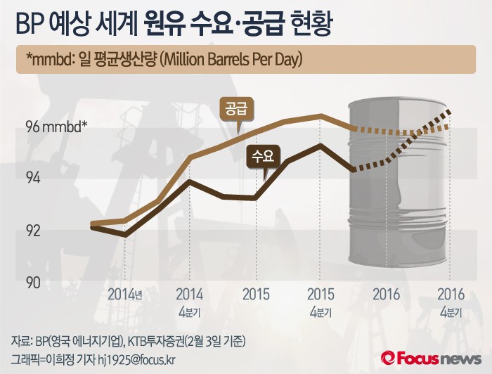 이어 “2020년에는 글로벌 석유수요가 회복돼, 배럴당 80달러 수준까지 올라갈 것”이라고 내다봤다.(서울=포커스뉴스) 영국 에너지기업 BP가 예상한 바에 따르면 2016 하반기부터 세계 원유 생산량 감소로 수요와 공급의 격차가 줄어들어 원유값이 안정될 것으로 예상된다. 2016.03.09 이희정 기자