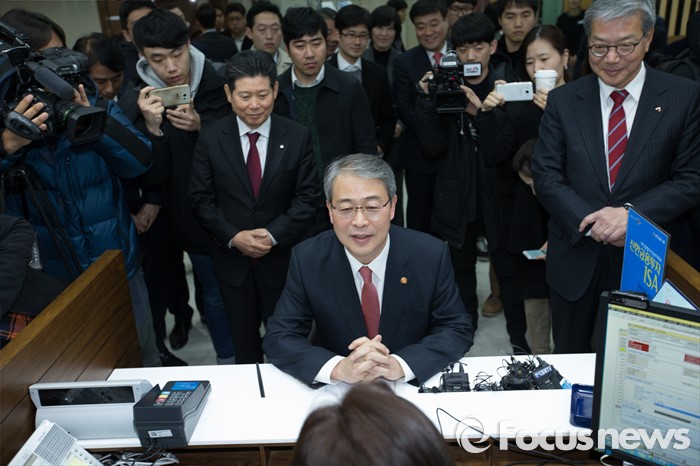(서울=포커스뉴스) 15일 오후 서울 여의도 신한금융투자 본사 영업점에서 임종룡(가운데) 금융위원장이 개인종합자산관리계좌(ISA)를 가입하고 있다.