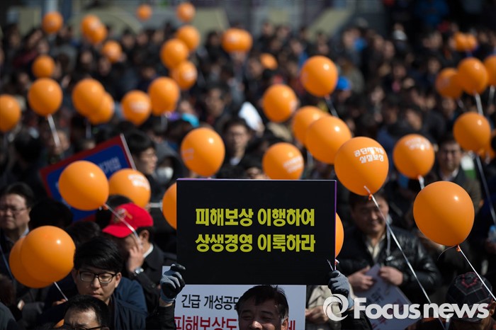 (파주=포커스뉴스) 16일 오후 경기도 파주시 임진각 망배단에서 개성공단 입주기업, 영업기업, 협력기업 등 대표를 비롯한 임직원과 가족들이 '개성공단 평화대행진 집회'를 하고 있다.
