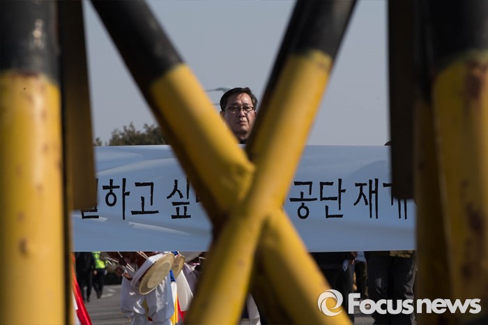 (파주=포커스뉴스) 16일 오후 경기도 파주시 통일대교에서 개성공단 입주기업, 영업기업, 협력기업 등 대표를 비롯한 임직원과 가족들이 공단재가동 및 실질보상을 촉구하며 '개성공단 평화대행진 집회'를 하고 있다.