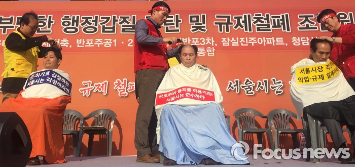 최진석 서울시 도시계획과장은 "2030 서울플랜은 수년간 시민들과 전문가들의 의견을 반영해 만든 것"이라며 "앞으로 서울 도시계획의 기본 대전제로 활용될 것"이라고 설명했다.18일 서울 시청 앞 광장에서 열린 '재건축·재개발 규제철폐 총궐기대회'에서 관련 단체 조합장과 추진위원장 등이 삭발식을 진행하고 있다. 박지선 기자