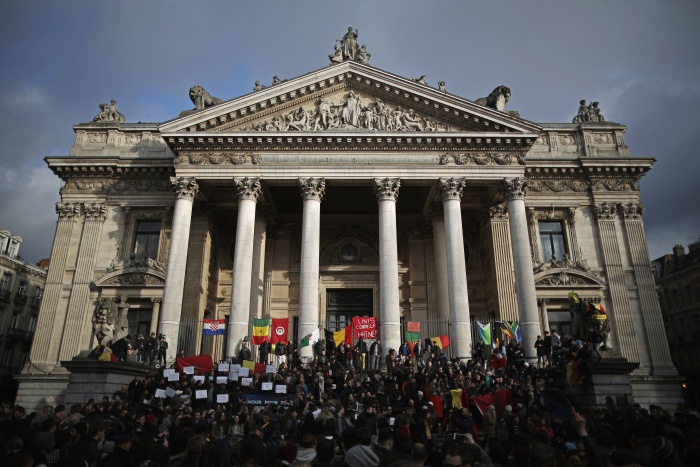 브뤼셀 자벤텀 공항과 멜빅 지하철 역에 대한 테러공격으로 34명이 사망하는 대참사가 발생한 지 하루 뒤인 23일 사람들이 브뤼셀 증권거래소 앞 브루스 광장에 모여 테러 희생자들을 애도하고 있다. (Photo by Christopher Furlong/Getty Images)