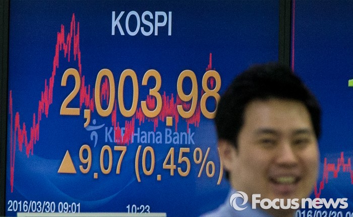 (서울=포커스뉴스) 30일 서울 중구 KEB외환은행 본점 딜링룸 전광판에 코스피 지수가 전일보다 9.07p (0.45%) 상승한 2003.98을 나타내고 있다. 이날 코스피지수는 재닛 옐런 미국 중앙은행(Fed) 의장의 비둘기파 발언에 힘입어 시가 기준 2000선을 돌파했다. 코스피가 시가 기준으로 2000선을 돌파한 것은 지난해 12월24일(2009.34) 이후 처음이다.