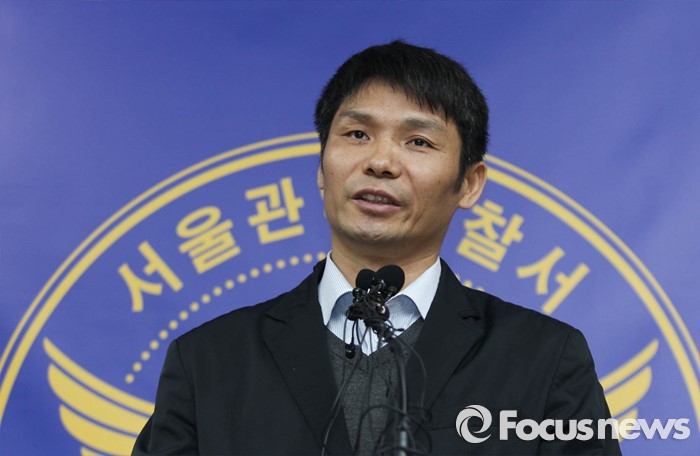 (서울=포커스뉴스) 4일 오전 서울 관악구 관악경찰서에서 신원미상의 민원인 여성이 경찰관 4명에게 염산으로 추정되는 액체를 뿌리는 사건이 발생한 가운데 관악경찰서 김차복 경위가 사건 브리핑을 하고 있다.