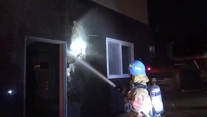 소방당국은 공사 중인 빌라 벽에 매설된 전선에서 합선이 일어나 불이 난 것으로 보고 정확한 원인을 조사할 예정이다.4일 오후 7시 38분 서울 도봉구 도봉동 신축빌라 2층 공사장에서 난 불을 출동한 소방관이 끄고 있다. (사진제공=서울 도봉소방서)