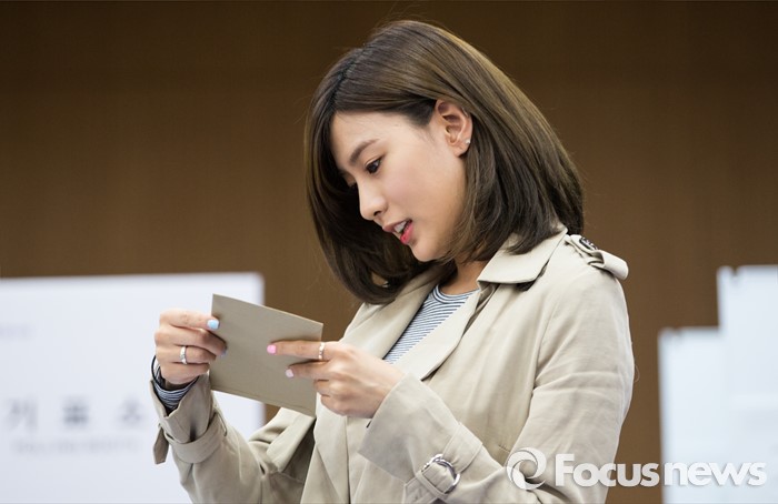 | △ 투표용지 살펴보는 에이핑크 오하영 |