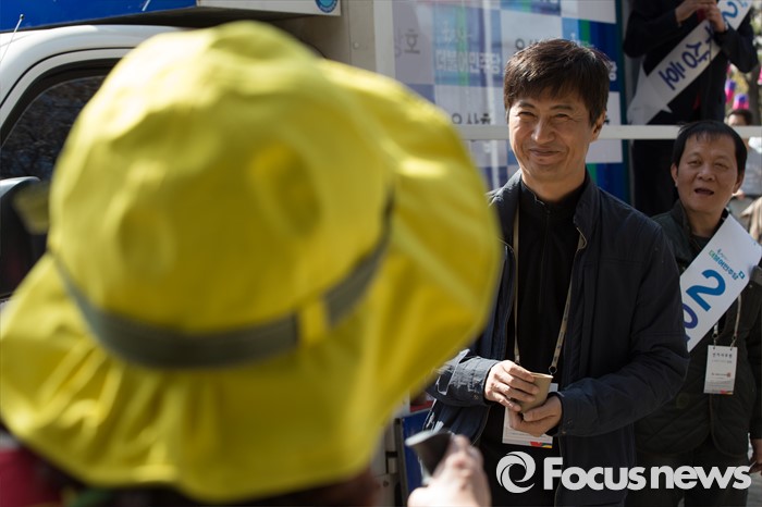 (서울=포커스뉴스) 11일 오후 서울 서대문구 청소년수련관 앞에서 우상호 더불어민주당 서대문구갑 후보가 영화배우 안내상, 우현과 함께 유세를 하고 있다.