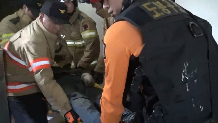 경찰당국은 자세한 사고 경위와 함께 작업자가 헬멧 등 안전장구를 제대로 착용했는지 여부를 조사 중이라고 밝혔다.20일 오후 4시30분쯤 서울 도봉구 쌍문동의 한 건물 승강기 철거 공사 중 1.2톤짜리 승강기 무게추가 넘어지는 사고가 발생해 출동한 구조대가 작업자를 들것으로 옮기고 있다. <사진제공=서울 도봉소방서>