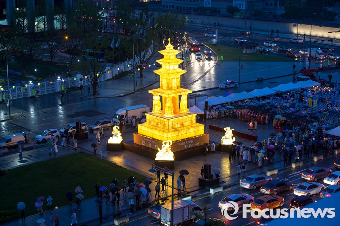 (서울=포커스뉴스) 20일 오후 서울 종로구 광화문 광장에서 부처님오신날(5월 14일)을 앞두고 봉축행사의 일환인 '사사자 삼층석탑등 점등식'이 열리고 있다.