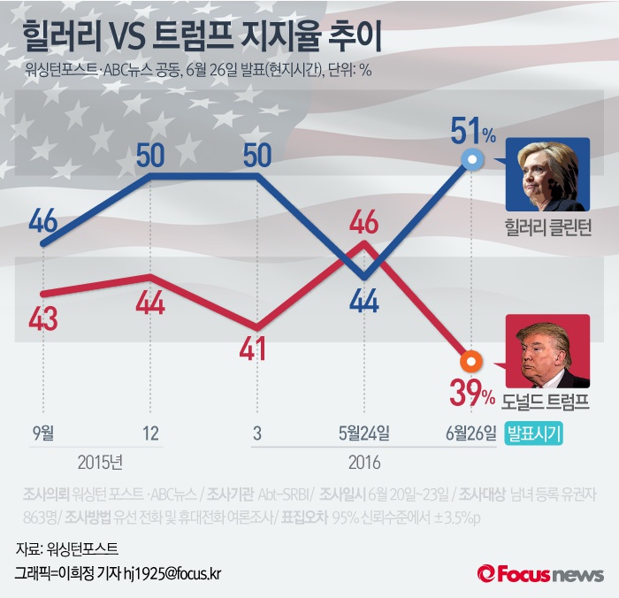 (서울=포커스뉴스) 미국 워싱턴포스트는 26일(현지시간) ABC방송과 함께 진행한 미국 대선 후보 지지율 여론조사 결과 "힐러리 클린턴 후보의 지지율이 상승한 반면 도널드 트럼프 후보의 지지율은 떨어졌다"고 보도했다.