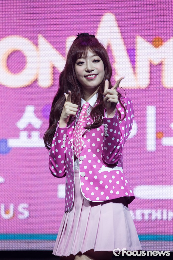 (서울=포커스뉴스) 29일 오전 서울 마포구 예스24 무브홀에서 열린 걸그룹 소나무의 미니앨범 '넘나 좋은 것' 쇼케이스에 참여한 멤버 수민이 포토타임을 갖고 있다.