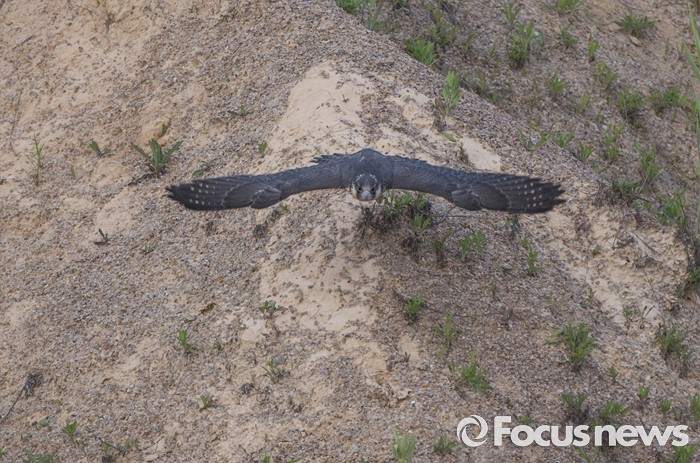 (인천=포커스뉴스) 송골매 유조가 인천시 수도권 매립지 들녘의 언덕에서 먹잇감을 찾아 할강하고 있다.