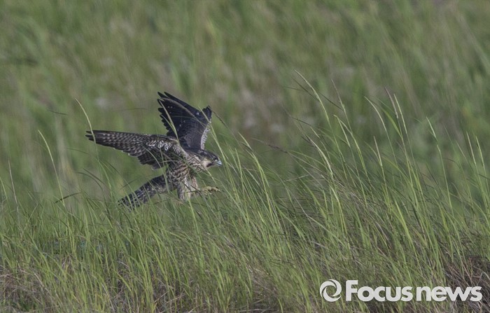 (인천=포커스뉴스) 어린 송골매가 인천시 수도권 매립지들녁의높은 곳에서 낮은 곳으로 내려 앉는 착지연습을 하고 있다.