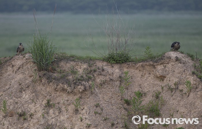 (인천=포커스뉴스)한국맹금보전회 가 재활 중인 송골매 남매(왼쪽이수컷) 가인천시 수도권매립지 들녘의 언덕에서휴식을 취하고있다.
