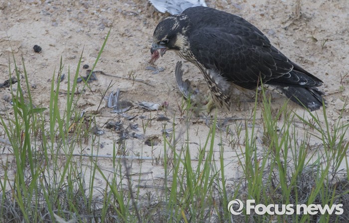 (인천=포커스뉴스) 송골매 암컷 유조가 인천시 수도권 매립지 들녘에서 자신 사냥한 작은 새를 채식하고 있다.