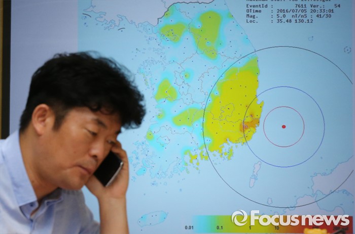 (대전=포커스뉴스) 6일 오전 대전 유성구 한국지질자원연구원 지진연구센터에서 직원들이 지진상황을 모니터 하며 분주한 모습을 보이고 있다. 지난 5일 오후 8시 33분께 울산 동구 동쪽 52㎞ 해상에서 규모 5.0의 지진이 발생했다.