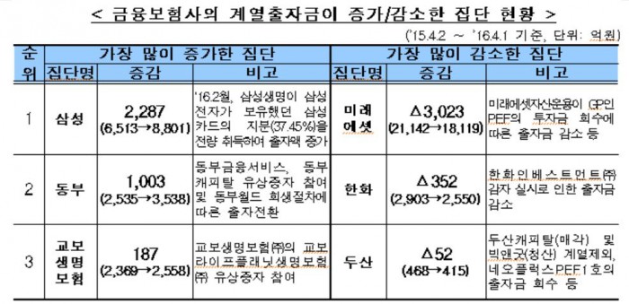 삼성은 삼성생명과 삼성화재를 보유하고 있으며 이 기간동안 2287억원을 비금융사에 출자했다. 이는 2016년 2월 삼성생명이 삼성전자가 보유했던 삼성카드 지분 37.45%를 전량 취득한 것이 원인으로 해석된다. 삼성 소속 보험사는 계열사에 전년 6513억원을 출자해, 총 출자금액은 8801억원이다. 출자 비중은 16.2%다.