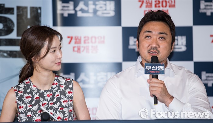 (서울=포커스뉴스) 12일 오후 서울 광진구 롯데시네마 건대입구점에서 열린 영화 '부산행' 언론시사회에 참석한 배우 마동석(왼쪽)이 취재진의 질문에 답하고 있다.