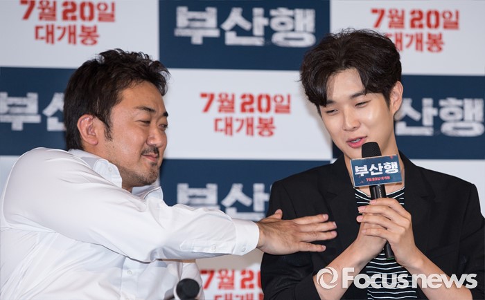 (서울=포커스뉴스) 12일 오후 서울 광진구 롯데시네마 건대입구점에서 열린 영화 '부산행' 언론시사회에 참석한 배우 최우식(오른쪽)이 취재진의 질문에 답하고 있다.