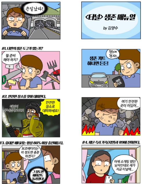 이번에 공개된 웹툰에는 누구에게나 닥칠 수 있는 위기 상황을 대비해 미리 알고 있으면 유용할 생존 매뉴얼이 담겼다.