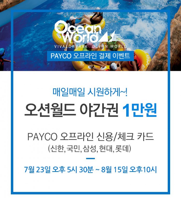 오션월드 현장에서 페이코 오프라인 결제를 이용하면 야간 입장권(정상가 3만원·성인 1인 기준)을 특별 최저가인 1만원에 구매할 수 있다. 원마운트에서도 페이코 우대가에 5000원 추가 할인 쿠폰을 제공한다.