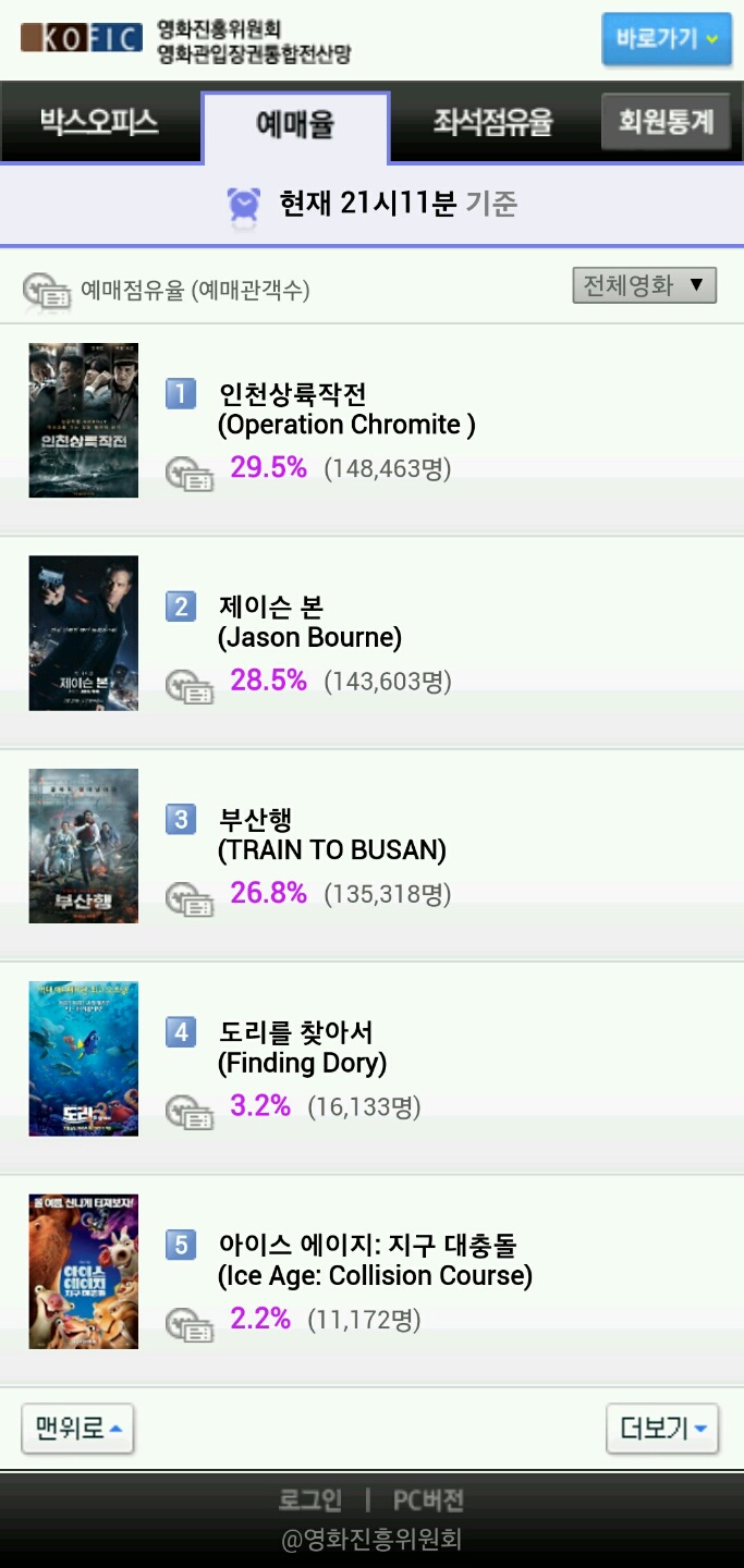 시사회를 관람한 일반 관객들 사이에서도 호평과 혹평이 엇갈리고 있는 가운데 '인천상륙작전'이 '부산행'과 '제이슨 본'과의 경쟁에서 우위를 점할지에 귀추가 주목되고 있다.영화 '인천상륙작전'이 26일 오후 9시11분 기준 예매점유율 1위를 기록했다. <사진제공=영화진흥위원회 영화관입장권통합전산망>영화 '인천상륙작전'의 스틸 사진. <사진제공=인천상륙작전 공식 홈페이지>