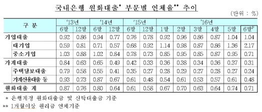 금융감독원은 6월말 국내 은행의 연체율은 0.71%로 전월말(0.74%) 대비 0.03%포인트 하락했다고 1일 밝혔다.