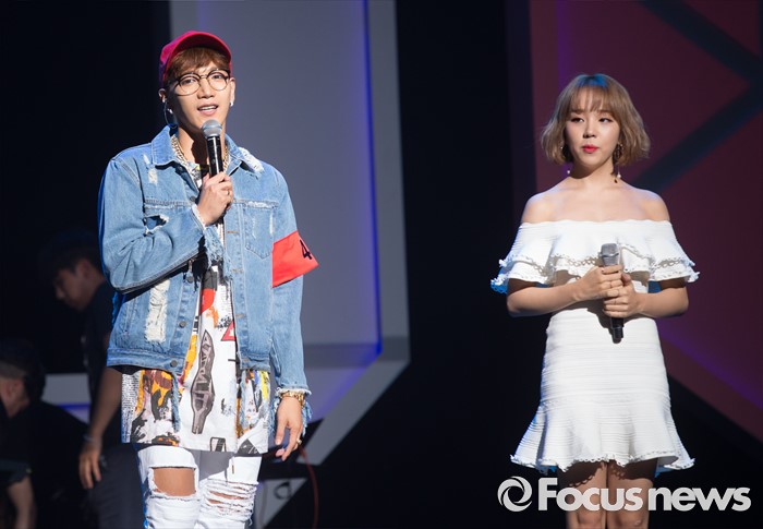 (서울=포커스뉴스) 8일 오후 서울 광진구 예스24 라이브홀에서 첫 솔로 미니앨범을 발표한 가수 준케이(왼쪽)가 백아연과 무대를 마친 후 인사말을 하고 있다.