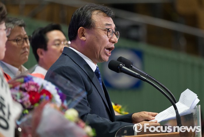 (서울=포커스뉴스) 9일 오후 서울 송파구 잠실실내체육관에서 열린 제4차 새누리당 전당대회에서 당대표로 선출된 이정현 의원이 수락연설을 하고 있다.