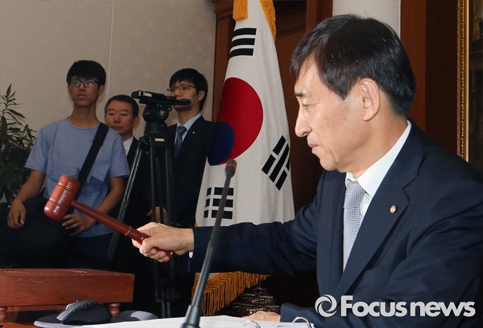 (서울=포커스뉴스) 11일 오전 서울 중구 한국은행에서 열린 제15차 금융통화위원회에 참석한 이주열 한국은행 총재가 개회를 알리는 의사봉을 두드리고 있다.