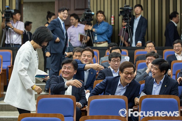 (서울=포커스뉴스) 사드배치에 반발하는 중국 측 입장을 듣기 위해 중국을 방문하고 돌아온 더불어민주당 의원들이 11일 오전 서울 여의도 국회에서 열린 의원총회에 참석 하고 있다. 왼쪽부터 손혜원 의원, 소병훈 의원, 신동근 의원, 김병우 의원.