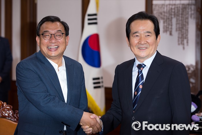 (서울=포커스뉴스) 이정현(왼쪽) 새누리당 대표가 11일 오후 서울 여의도 국회에서 정세균 국회의장을 예방해 면담에 앞서 악수 하고 있다.
