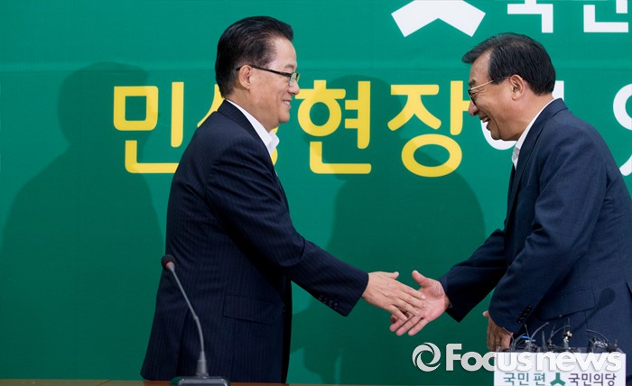(서울=포커스뉴스) 11일 오후 서울 여의도 국회에서 박지원(왼쪽) 국민의당 비상대책위원장이 이정현 새누리당 대표와 면담에 앞서 인사하고 있다.