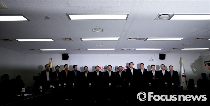 (서울=포커스뉴스) 11일 오후 서울 여의도 국회에서 열린 전기세 누진제 개편 긴급 당정 협의에 참석한 이정현 새누리당 대표, 정진석 원내대표, 유일호 경제부총리 겸 기획재정부 장관, 주형환 산업통상자원부 장관 등 참석자들이 취재진을 향해 포즈를 취하고 있다.